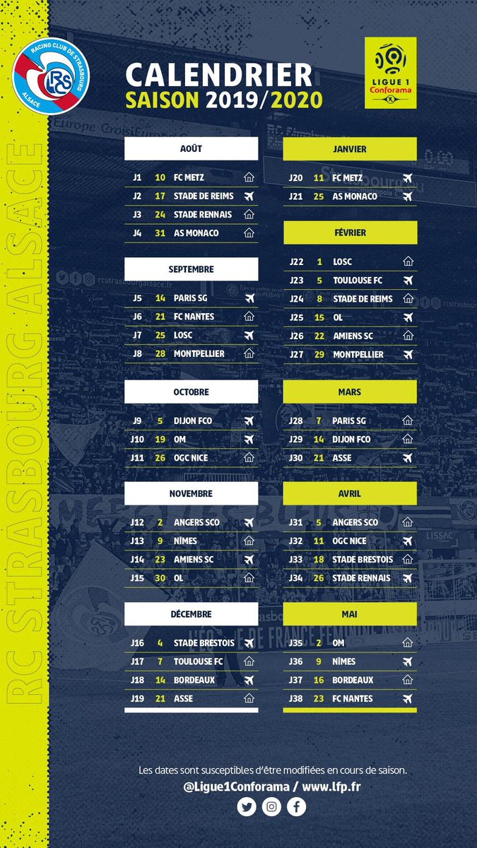 - Champion : le RCS se déplacera dans la capitale le 14 septembre avant de recevoir le champion 2018-2019 le 7 mars à la Meinau