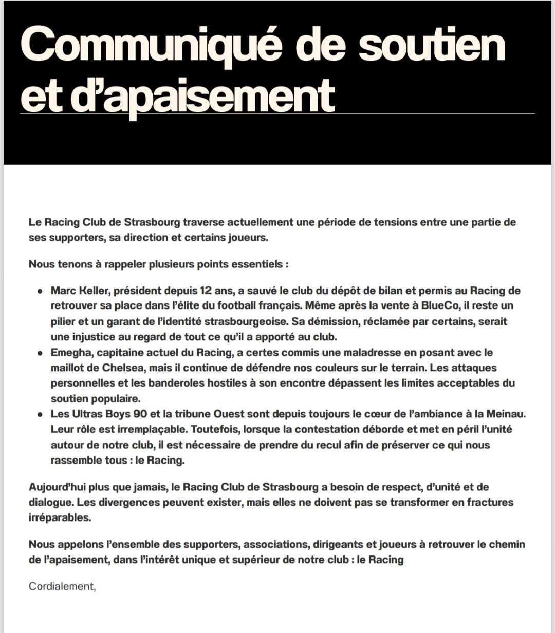 Le fameux respect demandé par les UB sur la grève, la tolérance sur la divergence d’opinions tout ça tout ça… C’était possible jusqu’aux banderoles honteuses déployées hier. Le soutien est total pour Marc Keller, Liam Rosenior et Emegha !