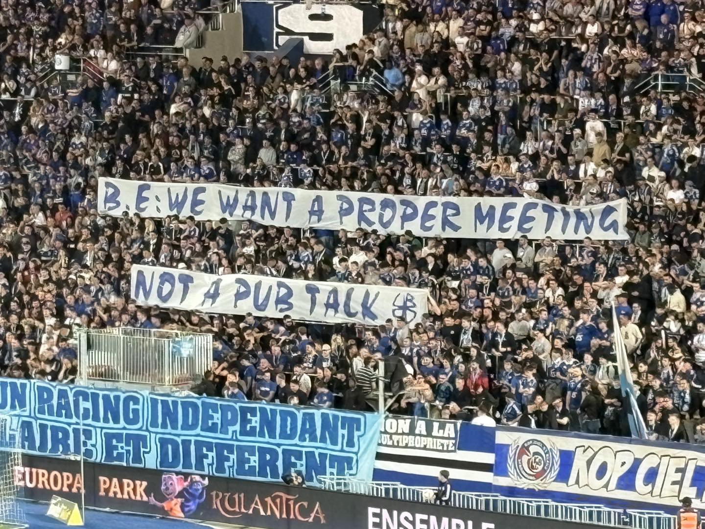 - Saison 2024–2025 (période de montée des protestations) : Les ultras instaurent des actions symboliques (silence de 15 minutes en début de match, banderoles, communiqués) pour réclamer transparence et garanties sur la conservation de l’identité du Racing