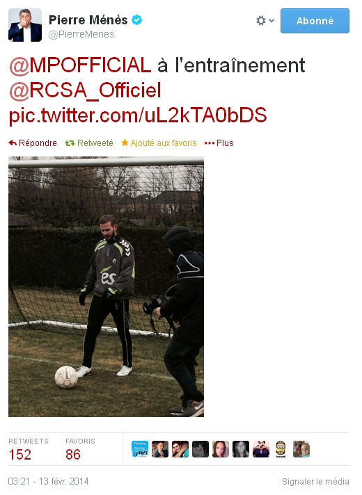 Actuellement en préparation d’un film sur le football, Pierre Ménès a passé quelques jours à Strasbourg accompagné de son acteur principal M Pokora. Ancien joueur passé brièvement par le centre de formation de Sedan, Mathieu Tota (de son vrai nom) en a notamment profité pour parfaire sa condition physique à l’entraînement avec le Racing. Sur son compte Twitter, le chroniqueur du CFC et cinéaste en herbe a dévoilé quelques photos de la séance. Une venue reprise par de nombreux médias nationaux, comme Public.
