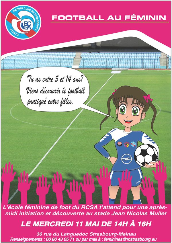 L’école féminine de foot du Racing orgenise le mercredi 11 mai de 14h à 16h une après-midi initiation et découverte au stade Jean Nicolas Muller (rue du Languedoc à la Meinau) pour les filles de 5 à 14 ans.