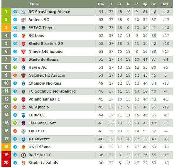 Un scénario terrible serait un nul face à Bourg-Péronnas et une victoire de tous ses concurrents : le Racing serait alors quatrième derrière Lens, devancé à la différence de but. En cas de match nul et d'un partage de partage des points d'Amiens à Reims, le Racing serait alors barragiste ! Bref, tous les scénarios sont encore possibles, un nul ou même une défaite ne les éliminerait pas de fait de la course à la montée mais rendrait l'avenir incertain et dépendant des autres rencontres. Ce que nos petits coeurs ne supporteront probablement pas ... et « l'homme à la rumeur de Colomiers » serait sûrement également de retour dans les travées de la Meinau (...). Mais ça pourrait ressembler à ça :