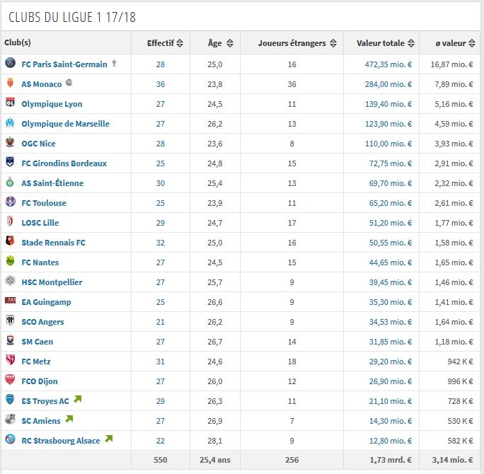 Au classement des clubs de Ligue 1, et même si certains transferts ou valeurs ne sont pas forcément actualisés, le PSG et Monaco se retrouvent très largement devant un Racing Club de Strasbourg qui n'affiche « que » 12.80 M€ de valeur marchande de l'effectif. Un Thiago Silva vaut autant que tout l'effectif du RCS ... Ouch !