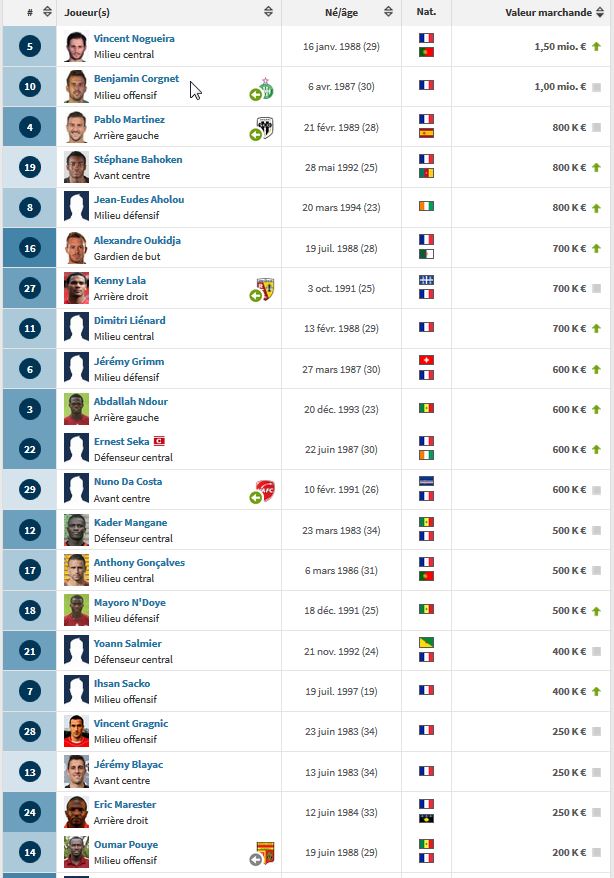 Du côté de l'effectif, c'est ... Vincent Nogueira qui bénéfice d'une bonne côté à 1.5 M€, devant Benjamin Corgnet, le dernier venu. Acheté 1.2 M€, Nuno Da Costa ne s'affiche qu'à 600k€ ...
