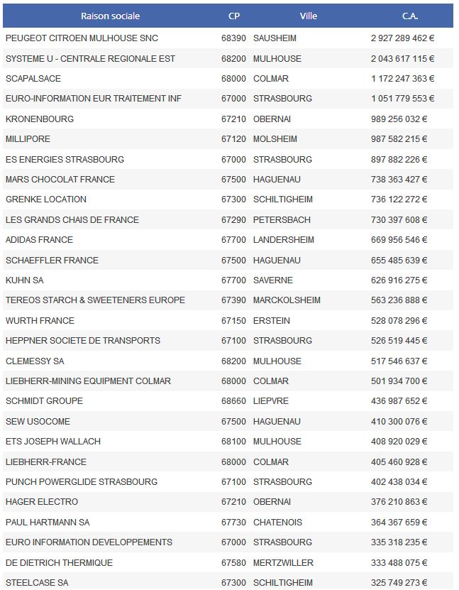 Si l’on se base sur le raisonnement allemand de la proximité de l’entreprise pour un futur « naming », il faudrait ainsi chercher dans les plus grandes entreprises alsaciennes dont voici la liste :