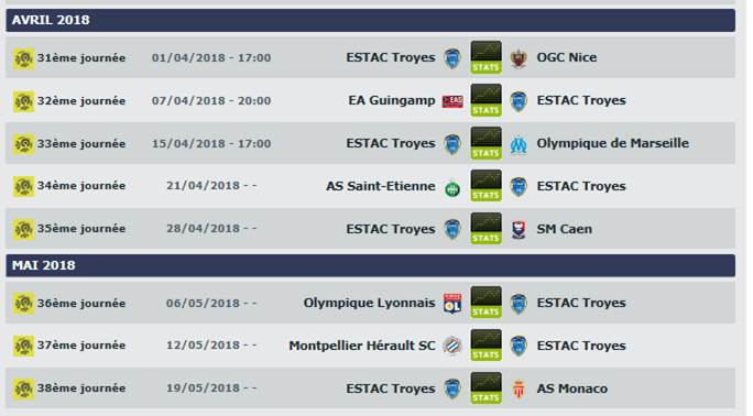 On prévoyait une saison compliquée pour les aubois et ce fût le cas. Les hommes de Jean-Louis Garcia ont été 8ème au soir de la 3ème journée, puis 9ème au soir de la 8ème journée. Depuis l’ESTAC a retrouvé l’anonymat du championnat et toutes les galères qui vont avec. Emmenés par un Benjamin Nivet quarantenaire et un Adama Niane, meilleur buteur de la Ligue 2 la saison passée mais qui a du mal à confirmer cette saison (7 buts), les Troyens vont avoir un calendrier compliqué, entre des équipes qui cherchent les derniers points pour le maintien (Guingamp, Caen) et celle pour l’Europe (Lyon, Marseille, …). On voit mal l’ESTAC s’en sortir.