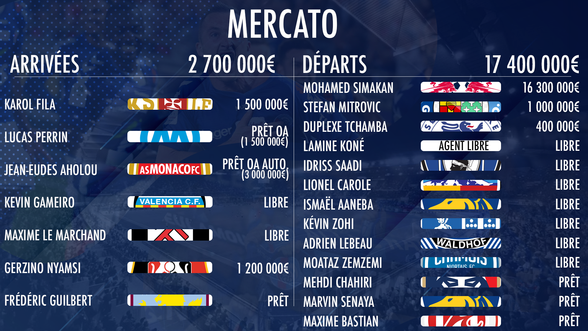 "Un mercato à deux vitesses. J'aurais autant pu dire 6/10 que 8/10. Un effectif dégraissé, avec de gros salaires en moins. Sans doute réinvestis dans d'autres, mais une balance positive en terme de masse salariale. Rassuré sur les idées du club (Perrin, Fila, Nyamsi), sur le romantisme de ce mercato (Guilbert, Gameiro), tout en proposant une nouvelle base (Le Marchand). 2,7 millions d'euros investis, 7 renforts. Le calcul est pas mal et les priorités ont été respectées malgré la petite enveloppe disponible. Petit regrette sur le dossier du milieu de couloir, notamment Ferhat, mais content toutefois que Strasbourg n'ait pas cédé. Très satisfait aussi que les joueurs cadres et majeurs de l'effectif n'aient pas été vendus à savoir Sels, Djiku, Thomasson, Ajorque. Certains jeunes pourront avoir du temps de jeu ailleurs pour progresser grâce aux prêts. Petite déceptions en revanche sur le retour d'Aholou, en prêt avec obligation d'achat de 3M et l'option d'achat quasi automatique d'1,5 millions sur Lucas Perrin. Ca fait déjà entre 3 et 4,5 millions d'euros d'investis l'année prochaine. Il faudra donc vendre. Dommage aussi d'avoir bâti cette équipe après déjà 4 journées, mais les derniers jours offrent des opportunités non négligeables... Du retard a été pris, espérons que l'alchimie prenne et que les recrues soient rapidement au diapason."