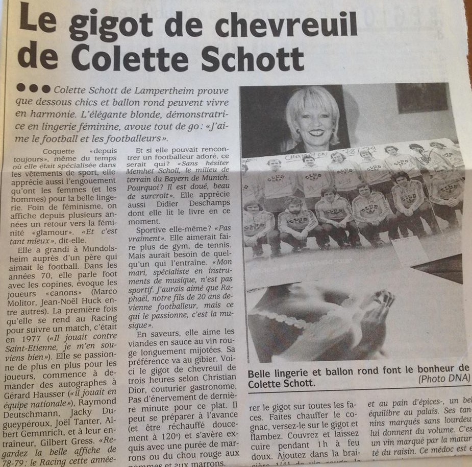 Fan du regretté Dropsy, « un grand gardien, paix à son âme », Gemmrich ou encore Zitelli, Colette a également fait deux émissions de télévision sur le Racing. « Avec Claude Leroy, c'était peut être pas la meilleure (rires !) et et une avec Simone Morgenthaler dans "sur une siess" où le sujet étant mon amour du Racing et le fait que je vendais de la lingerie ».