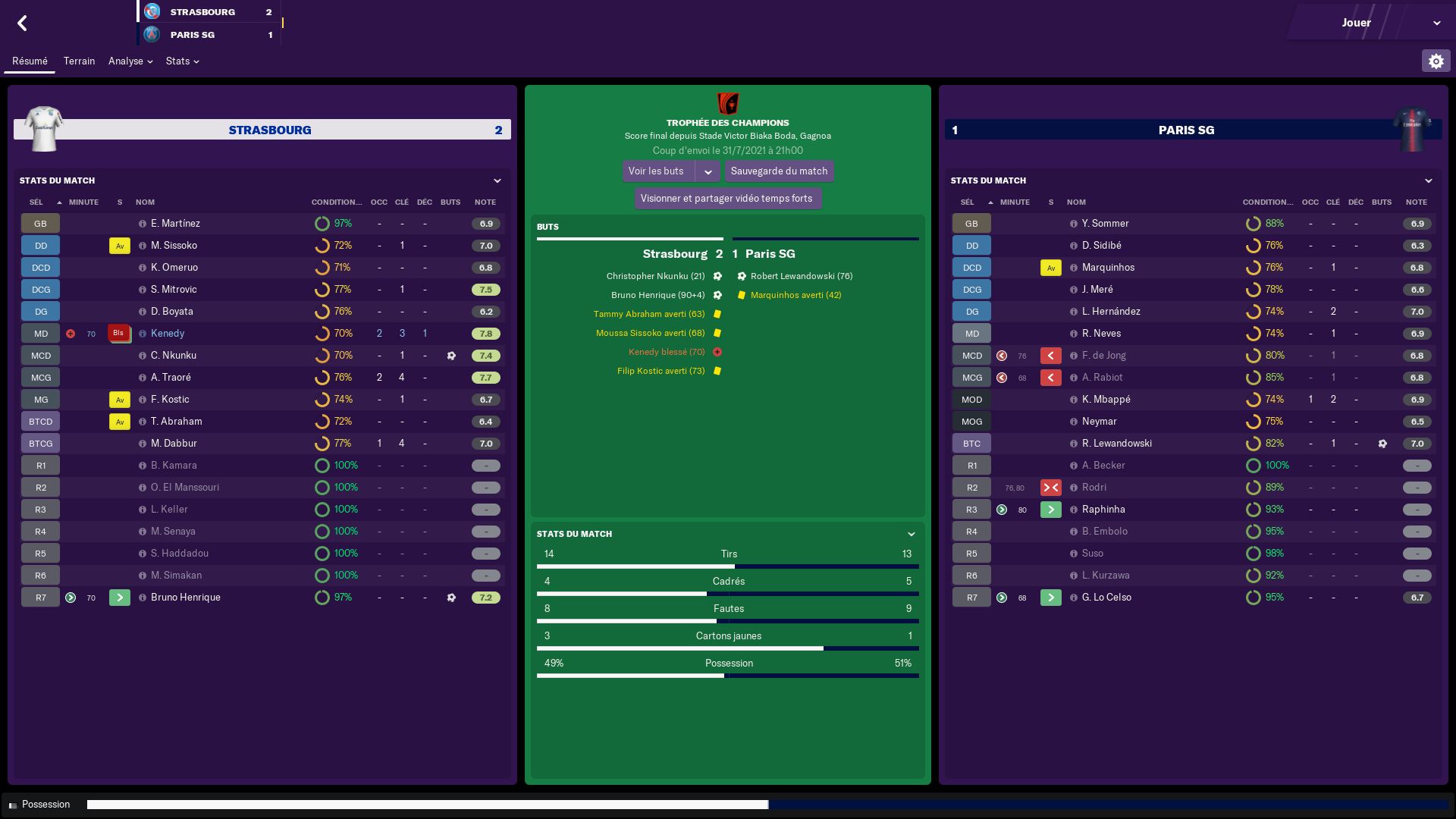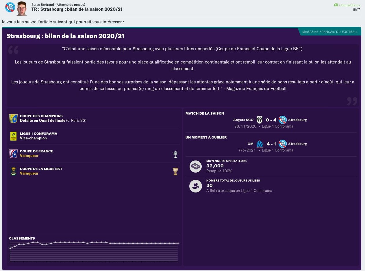 Au terme de la saison 2020/2021, le Racing est bien installé en Ligue 1. Malgré un combat de haute lutte, il est impossible de faire descendre le PSG de son trône de champion de Ligue 1. Le club de la capitale dépense à chaque mercato estival entre 170 et 230 ... millions d'euros en arrivées. Il reste donc les coupes pour ramener des trophées en Alsace, et la Ligue des Champions pour se faire plaisir avant ... d'être éliminé par le PSG ...