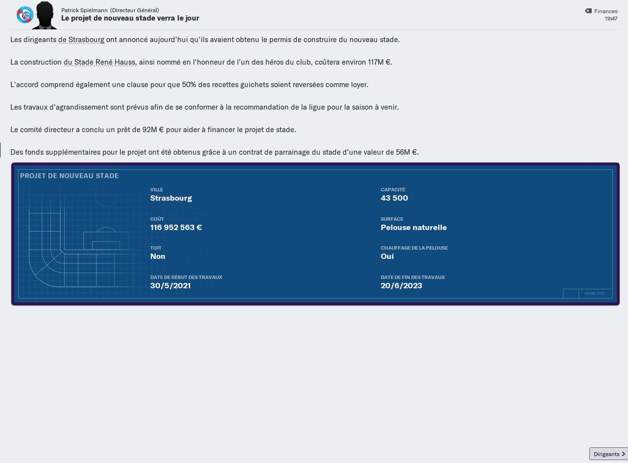 Un stade plein, des matchs à guichets fermés, ... ont donné des idées aux dirigeants. Contrairement au projet actuel, Marc Keller de FM2019 et ses actionnaires ont choisir de construire un nouveau stade : le Stade René Hauss !