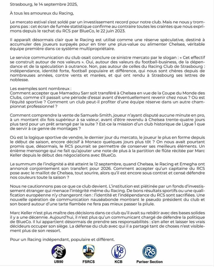Présent depuis plus d'une décennie au club, moteur de toutes les remontées et acteur majeur de la reconstruction de la Meinau, Marc Keller a cette fois ci été la cible du kop qui lui demande « de prendre ses responsabilités : s'en aller et laisser les vrais décideurs occuper son siège ». Une demande qui impliquerait l'arrivée d'un actionnaire de BlueCo avec qui, sans aucune surprise, le dialogue ne serait sûrement pas prêt de passer non plus. Qui pourrait dire où serait le Racing sans BlueCo ? une descente comme Montpellier ? Qui peut dire ce qu'il arrivera avec BlueCo ? une triste histoire comme Bordeaux ? Sûrement personne, et seul l'avenir nous le dire.